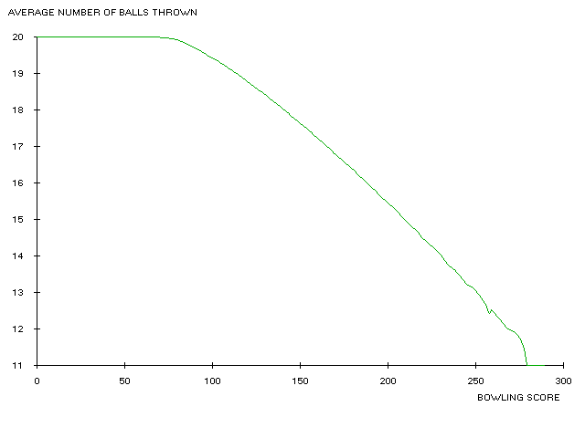 As expected, the average score increases with the number of strikes and spares, and the influence of strikes increases with larger scores. It's easy to see from the contour lines in this diagram how much we can expect to increase our average score with more strikes or spares. (The contour lines themselves are only a visual aid since we obviously can't have a fractional number of strikes or spares.) The information in this diagram is presented in tabular form below, along with the minimum and maximum scores possible for various quantities of strikes and spares: