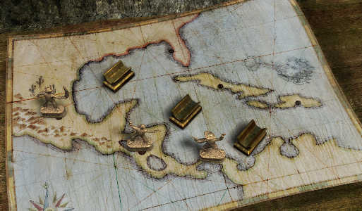 Using the Enigma's reference to hook, pegleg, dagger and pistol, hit the following sequence of squares on the 6 x 4 grid where the shadows are cast: