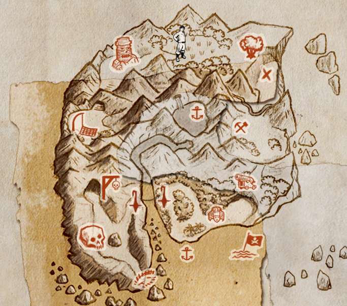 Fifteen men on the dead man's chest,Proceed down the beach to the right of the stone idol