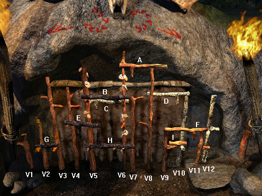With the exception of poles V5 and V6, each stick or pole can be rotated clockwise or counterclockwise using the corresponding red >>> or <<< symbols on the rock overhead. Sticks can be moved to the left or right using the red arrows there. The objective of this puzzle is to clear a path into the shrine between the immobile poles V5 and V6. Arok is assumed to be shorter than those poles.![]()