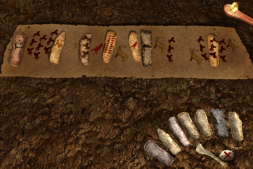 For example, one of the matches is produced by striking the bone hammer on the leftmost stone on the animal skin (#1), then striking it on the rightmost Musical stone (#7) at lower right (or vice-versa).