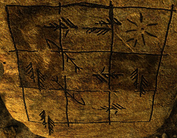 Go back to Tika's room where there is a large shelf at left below a row of symbols. Pick up an Engraving of a fish and an Engraving of a stag. The eleven symbols here represent the segments of the gameplay so far, but they must be put into chronological order. Numbering the symbols from 1 to 11 left to right,