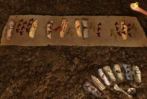 Cross the water to a thin strip of rock in the middle of the lake. Move to the other end and pick up an Aurochs horn and a Long branch. Retrace your steps back across the lake and up to the ledge at the top of the shaft, then use the Aurochs horn to collect some embers from the fire there. Make a one-way trip back to where you found the horn and use it to light the fireplace on the rock in the water. This discloses a row of fourteen stag paintings on the cave wall.