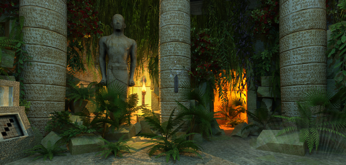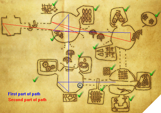 Direction Elevation Location North Horizontal Rectangular template just left of the left stone figure's head Narrow stick below the left column Green pigment pile at the foot of the right column Up Thin horizontal stick in the mouth of the stone serpent at the left side of the lintel Decorative panel a couple of stones above the center of the lintel East Horizontal Cream-colored canvas at the lower right corner of the trapezoidal opening Up Decorative panel above the yellow wall medallion Yellow pigment pile to the lower right of the yellow wall medallion Down Two red pigment piles at the foot of the steps South Horizontal Purple pigment pile at the upper right corner Polygonal flat object halfway up the left column Up Thin dark stick in front of the left snake head carving Light-green canvas about 3/4 of the way up the wall over the center of the lintel Roughly L-shaped piece at far right, next to the right navigation arrow Down Light green pigment pile West Horizontal Red pigment pile at the lower left corner Yellow pigment pile at the lower center Cream-colored canvas above the (?) icon in the status bar Up Wooden rectangle on the wall at center