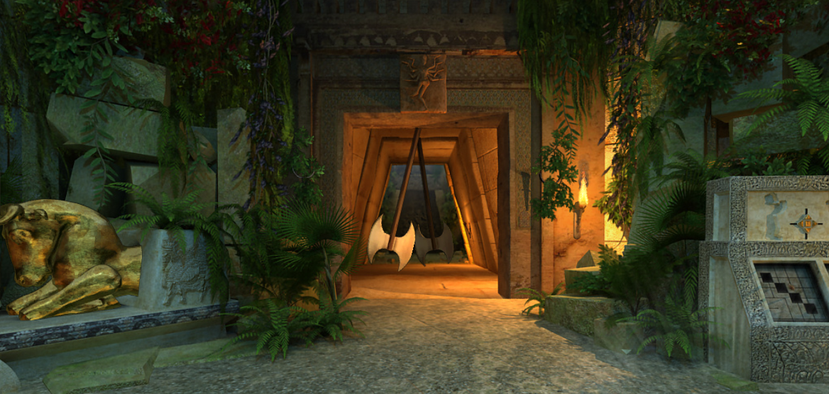 Solving the puzzle gets you the Statuettes in your inventory. Back out and face the moving blades in the west direction. Zoom in on the console at right.