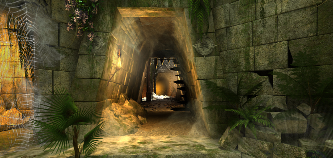 After the Fall, you're facing a stone temple, perhaps in Asia. The intro to the game control interface serves to open the gate. Pick up the Hat and Whip and move forward into the unexplored area of the temple. At the edge of the lava pit, you're facing south and down, where north is taken to be the top of the map accessed by the (*) button in the game interface at the bottom of the screen. Look up to see that the cardinal directions in this octagonal room are described as follows:![]()