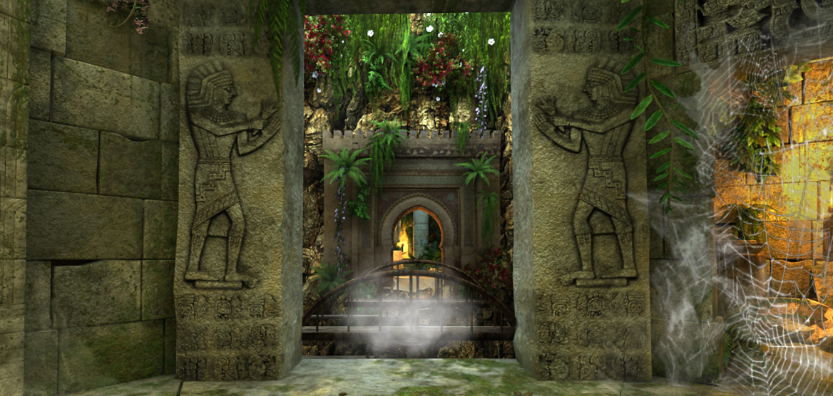 Click on an image for a larger view. Face southwest and enter the alcove flanked by two horse-like statues. Move the mouse over the blades to trigger a comment, then click anywhere on the box of 16 shelves. Solve the HOG for 8 statuettes: