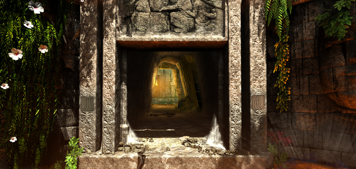 Solving the puzzle opens the gate. Face west and enter the alcove beneath the two-headed snake. Click on the depressed area on the wall in the shape of a statue.![]()