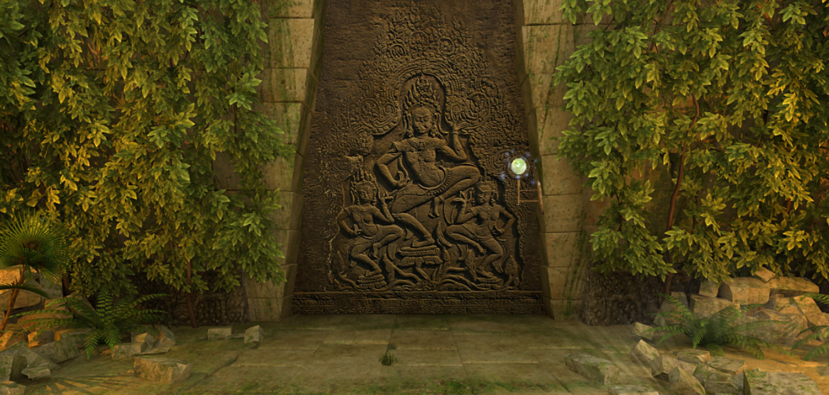 Direction Elevation Location North Horizontal Touching the bottom left of the opening Hiding behind a fern at the upper right of the opening Up Underneath a white flower at far left In the approximate direction pointed to by the seated figure in the bas-relief Rectangular piece exactly on the left corner of the bas-relief East Horizontal Hiding behind a fern at the lower right of the opening Halfway up the column of flowers to the right of the opening A lighter-colored spot at the extreme upper right corner of the screen Up A bright white piece on a string of foliage at the upper left corner of the screen Near the center of the screen, behind a hanging green vine Behind an undulating tree root at left center South Up Yellowish triangular shape near the center of the screen Squarish piece just below a bright red flower in the center region of the screen On ledge near the right side of the screen West Horizontal Triangular piece to the left of the lower-left portal corner Rectangular piece near the lower left corner of the screen Up Behind a fern near the upper right corner of the portal Smaller piece just to the right of the top point of the portal At left edge of white/orange flowers to the left of the portal