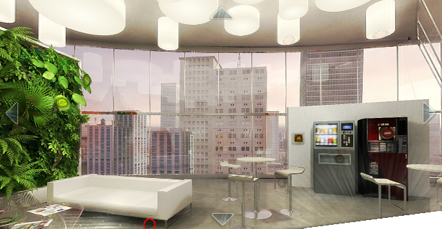 Move the X88 component from inventory to the beaker at position 7. Back out and use the map to go to the Lounge. Zoom in on the vending machine there. Click on the coin slot, then back out and rotate around to solve the HOG for 20 tokens:![]()