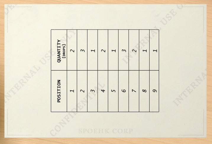 4 x 4 x 6 + 4 produces 100Return to the Laboratory. Zoom in again on the bench and transfer the Sweet drink from inventory to the beaker in position 2. Using the pipette on the table, transfer drops of each liquid (one drop at a time) to the large Erlenmeyer flask according to the formula (16 drops total). Use the stopper on the table to seal the flask and store it in your inventory.4 x 4 x 9 + 1 produces 145