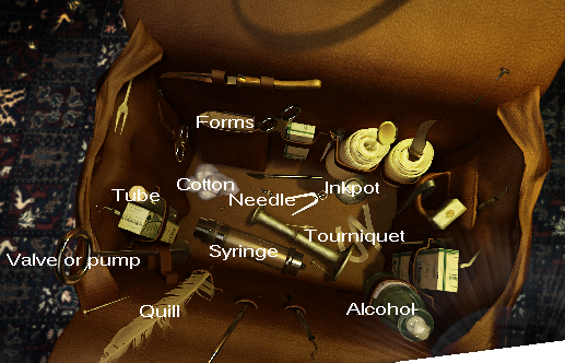 Return to the Patient's room and put the Pieces of wood into the fireplace. Pick up 7 items from the doctor's bag in the requested order: