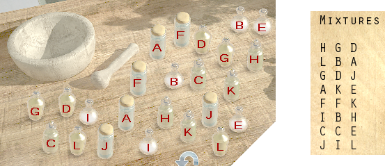 Pick up the Pestle and drag it over the mixture until done. Pick up the Mixture to be distilled and return to the Attic. Click on the table at right, then on the desk. Solve the still jigsaw:![]()