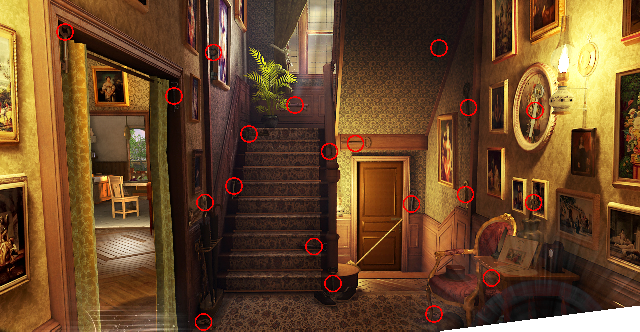 Return to the Entrance and remove the broom that's blocking the Cellar door. Again drag its deadbolt to the left to enter the Cellar. Solve the HOG for 15 saltpeter samples. Slowly scan the walls in this room, watching the glowing cursor for a shrinking diameter and green-colored sparkles. Each viewpoint is reached by rotating right once from the previous viewpoint:![]()