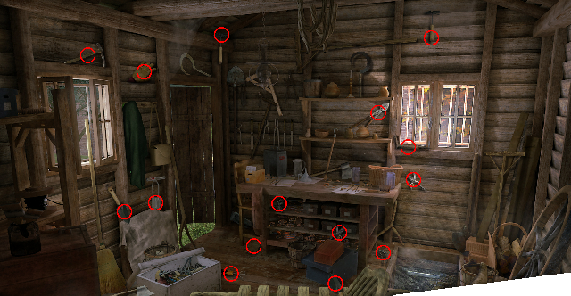 Back out and re-enter the Veranda at right. The shed door has magically closed. Enter the Shed and solve the HOG for 15 gardening tools: