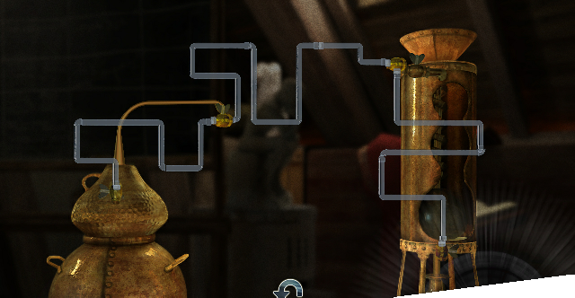 Return to the Attic. Move the Mixture and Tubes from inventory to the table at right. Solve the still assembly puzzle:![]()