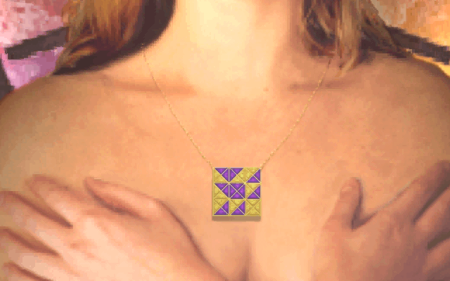 Take the spiral staircase back to the Sanatorium. Return via the elevator to the foyer of the movie theatre on Deck 3. Facing the theatre, turn left and zoom in on Jan's stateroom door. If necessary, operate the buttons on the left to reset the squares on the right to their initial all-yellow state, then create the mirror image of Claire's pendant
