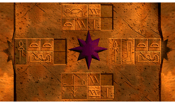 To solve the theatre entrance puzzle, refer to page 16 of the "Egyptian Hieroglyphs Explained" book in the Flashback menu (this book was encountered before crossing the underground lake at the beginning of the game). This Egyptian compass puzzle starts randomly each time it is played. The answer is:
