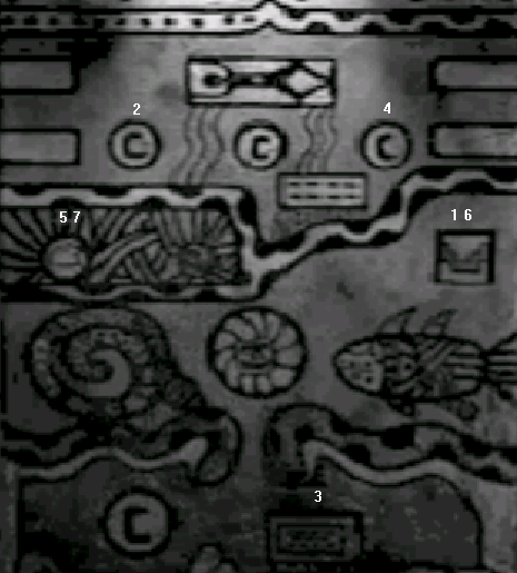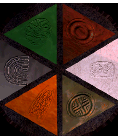 Move black gear from 2 to 1(gearpost 8 is not used). Turn the crank to raise the stepping stones across the water. Exit the gazebo, turn right and cross the water to the Stonehenge display. By looking through the left arch, check out the tan-colored design carved into the rocky hillside of the museum, looking like a cross inside a circle. Look down to see the hexagonal museum entrance puzzle. Its solution is entered using the six colored symbols seen earlier: