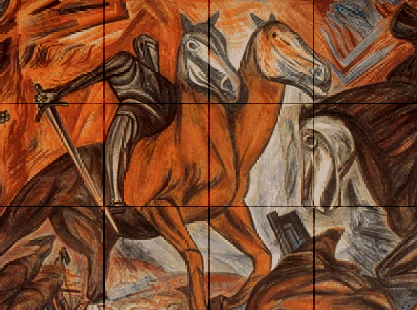These rooms are accessible from a doorway in Man's Inhumanity to Man. At the end of the first L-shaped room is the Phoenician Puzzle controlling access to the next room through a panel in the wall. After the puzzle is solved, back out and the lower panel with question marks is now ajar. Go through this door into the next puzzle room. Click a few times only on the right-hand image Still life with skull, candle and book by Paul Cézanne, until a human-shaped depression can be seen in the checkerboard wall ahead. Click forward toward this shape as far as possible, then turn right to access the Pinball Machine puzzle. After that puzzle is solved, proceed through the now-open doorway in the checkerboard wall and access a pot or lid at the far end of the bridge.