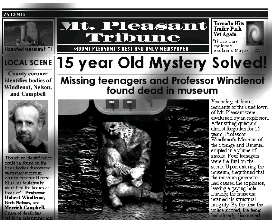 Item Location Intro Movie Start of new game Beth's Ghost Clock tower Merrick's Ghost Fortune Teller's room Windlenot's Ghost Far side of Underground Lake Ancient Astrology Backpack in Myths and Legends Scrapbook On desk in Museum Office Museum Brochure In desk drawer in Main Entry Hall In Search of the Unexplained Pale orange book on top shelf in Library Egyptian Hieroglyphs Explained Near side of Underground Lake South America Pictographs White book on top shelf in Library Mythology of the Stars Purple book on middle shelf in Library Black Book Tilted green book on top shelf in Library Theatre Movie Projection Room Museum Blueprints Bimini Island pedestal in Mysteries of the Deep Beth's Address Book On stairs in Corridor 1 Merrick's Notebook Under lion coffin in Funeral Rites Professor Windlenot's Diary On desk in Bedroom Finale Generator room in Power Plant