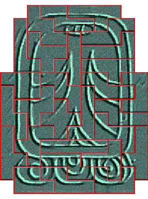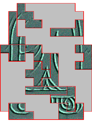 After the puzzle is finished, you can pick up a lid or pot from inside the Sumerian bull at right. Go to the red door at the other end of the room. A placard at right identifies this as the Chuen Door, but Beth called it the Red Door in her address book. Access the puzzle panel to the left of the door. Press the red button at the bottom to exit and reset the puzzle. The starting layout of pieces is randomized. A piece outside of the placement area can first be rotated clockwise by clicking on it. It may be simpler to start by placing the two U-shaped pieces, the single long piece, the two pieces containing a 2 x 2 square, the two W-shaped pieces, the single plus-shaped piece, the three L-shaped pieces and the single T-shaped piece, all of which may be easier to recognize than the remainder. This represents 12 of the 28 total pieces to be placed: