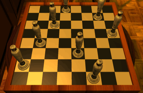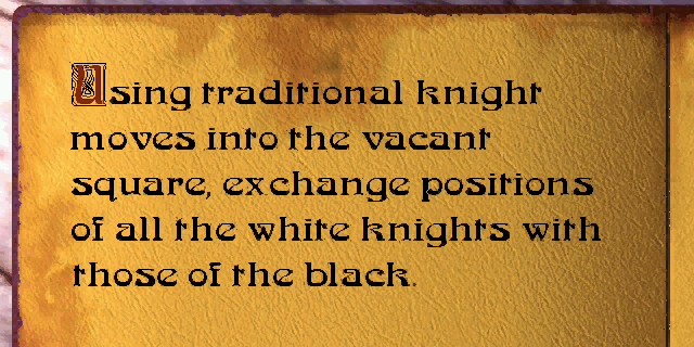 If you need a hint, you can access the Library through the sink and its resident spiders. The objective of this puzzle is simply to exchange the positions of 12 black and 12 white chess pieces using the usual knight moves. Click on one of the knights to move it onto the single empty square. As in the Bishops Puzzle played earlier, it's not necessary to alternate moves between white and black pieces.![]()