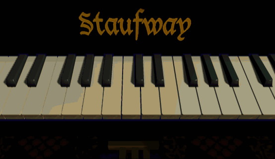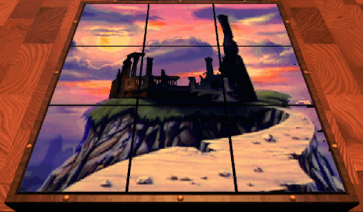 On completion of the puzzle, a nifty 3-D animation of Stauf's picture is shown. Move right and into the piano picture to be transported to the Music Room.