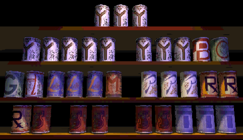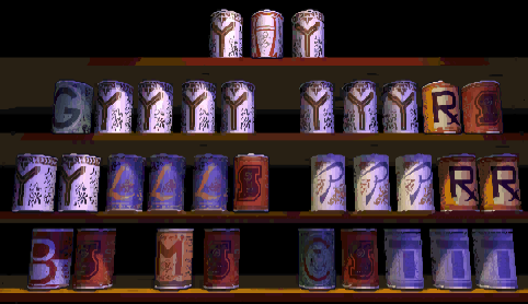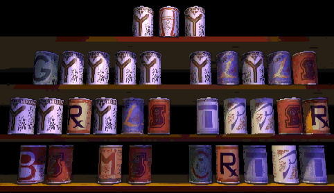 along with some cheesy voice acting. Here is a collection of letters on cans, arranged alphabetically except for eleven Y's at the beginning. The objective of this puzzle is to swap pairs of cans to spell out a sentence of sorts, consisting of words that have only y's as vowels. The only two-letter English words containing a y as their only vowel are "by" and "my", so given the rest of the letters present as well as the spooky environment of the game, it's a good bet that the last line is "by my crypt". The full solution is:![]()