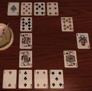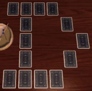 If you need a hint, you can access the Library by turning around and using the right-hand door of three (the left-hand door returns to the Kitchen and the center one to the hallway). The objective is to turn over all 14 cards. Once a card is uncovered, the next one must be selected from the same row or column, but without reversing direction. The ranks of the disclosed cards indicate the order of selection. You can jump over uncovered cards, but not face-down ones. One solution is to follow a counterclockwise inner circle, then continue with a clockwise outer one and a jump to the center:![]()