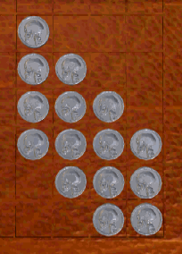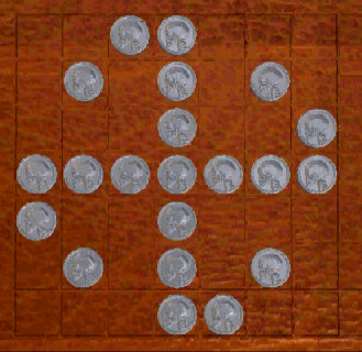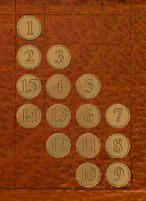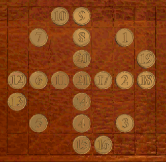 If you need a hint for this puzzle, the nearest Library access is through the sink in the bathroom across the hall. Turn over all of the coins in the pattern by tracing a continuous rectilinear path. Once a coin is flipped over and turns gold, it cannot be revisited. You can jump over gold coins, but not silver ones. You must start or end the puzzle from the isolated coin at the top. One of several solutions is simply to move clockwise around the perimeter from the top:![]()