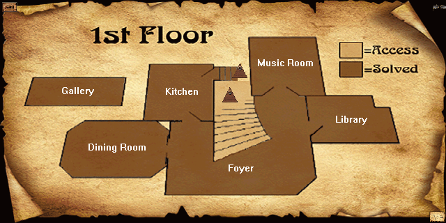 Dining RoomClick the triangular Sphinx pointer icon on the curving staircase on the 1st Floor map to access the upstairs map, in which no rooms are yet accessible off of the hallway. Back in the game, make your way from the foot of the main staircase through the double doors at left into the Dining Room.