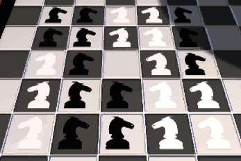 Step 1: At the beginning of the puzzle, it's relatively easy to transfer knights back and forth across the boundary, since no pre-existing positions need to be retained. One method is to use zigzag paths that put 12 pieces in position after 16 moves. However, this approach leaves the out-of-position knights asymmetrically spread out on the board and doesn't solve any corner positions. A more effective approach with better choices for subsequent moves is to start by moving the space counterclockwise around the 3 x 3 square in the lower left corner of the chessboard:The complete 36-move solution described here is:P W L U R K V MThis is equivalent to clicking on the following positions in order:![]()