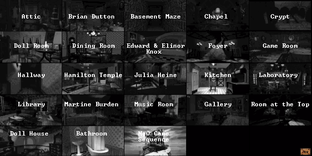 As in the original game, restoring a game or consulting the in-game map resets your location to a fixed "home" position in each room or hallway. Whenever you find a drama mask icon, you can optionally click on it for a one-time video clip of the game's live-action characters (or occasionally a repeatable computer animation). The FMV clips aren't available in Open House mode, so you'll have to restore a saved game to replay them. They are not required to advance the gameplay, but can be useful to shed light on backstory elements. If you encounter a chattering teeth icon, you can (repeatedly if desired) click on it to see a supernatural event of varying spookiness. These are also not required in order to proceed in the game.
