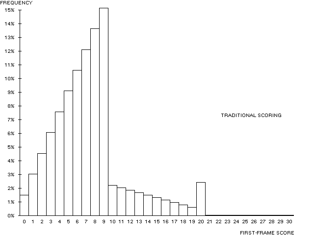 First, it seems evident that the total number of possible ten-pin bowling games is quite large. We have eleven possibilities for the first ball thrown in the first frame (gutter, 1, 2, ..., 9, strike), and the same possibilities occur for each of the other nine frames. So without even considering the second ball in each frame, at a minimum we have 1110 = 26 billion possibilities. In fact, the true number of games is much, much larger due to the effect of the second ball in each frame. It's easy to show that the total number of possible games using traditional scoring is