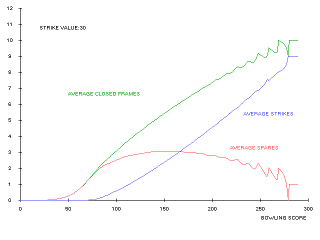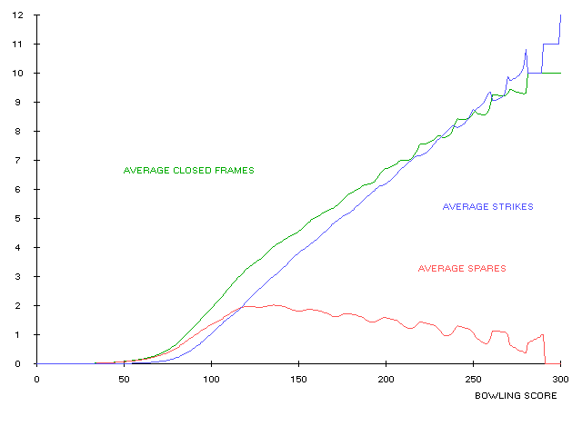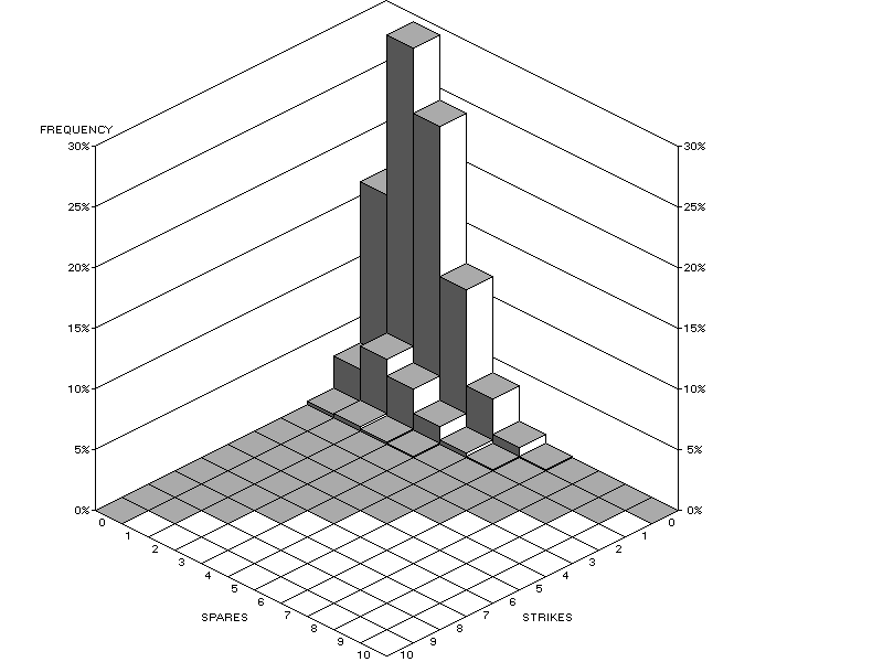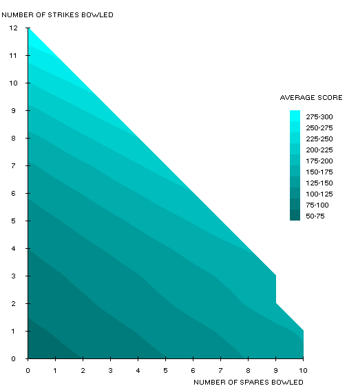 As expected, the average score increases with the number of strikes and spares, and the influence of strikes increases with larger scores. It's easy to see from the contour lines in this diagram how much we can expect to increase our average score with more strikes or spares. (The contour lines themselves are only a visual aid since we obviously can't have a fractional number of strikes or spares.) The information in this diagram is presented in tabular form below, along with the minimum and maximum scores possible for various quantities of strikes and spares: