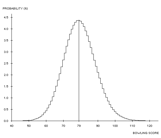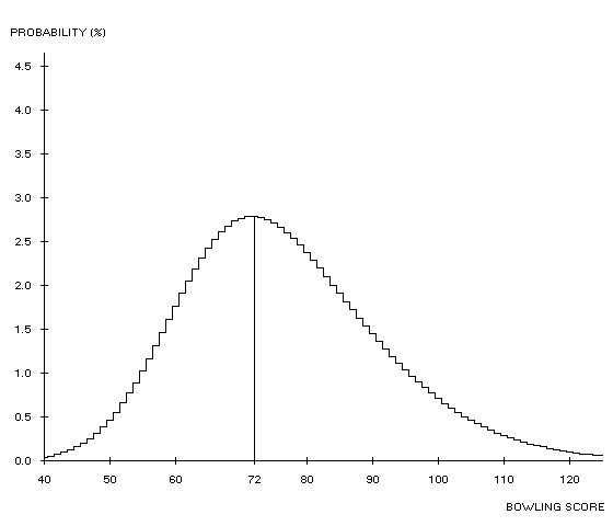 For example, if we bowl 98 or higher, we're already in the 90th percentile of all possible bowling scores. The median, or 50th percentile, of the score distribution is 79.