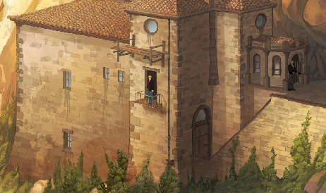 Gameplay is without significant faults. The game startup is fast, requiring none of the usual clicking through logos. About 5 seconds after startup, the main menu is displayed and an in-progress or previously-saved game can be loaded. There are a handful of puzzles throughout the game, most of which are relatively easy. Several tongue-in-cheek references are made to the infamous goat puzzle from the first game, and there are some tie-ins to other characters seen in the earlier games. A convenient menu selection provides backgrounds on characters as they are encountered in the game. Most gameplay challenges involve information-gathering from other characters. As a result, there are many long dialog sequences, which can be skipped on replay by repeatedly clicking the mouse. Verbal asides from the main characters are easily distinguished by text at the bottom rather than the top of the screen. Several timed sequences are encountered, but none are difficult.