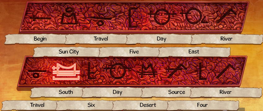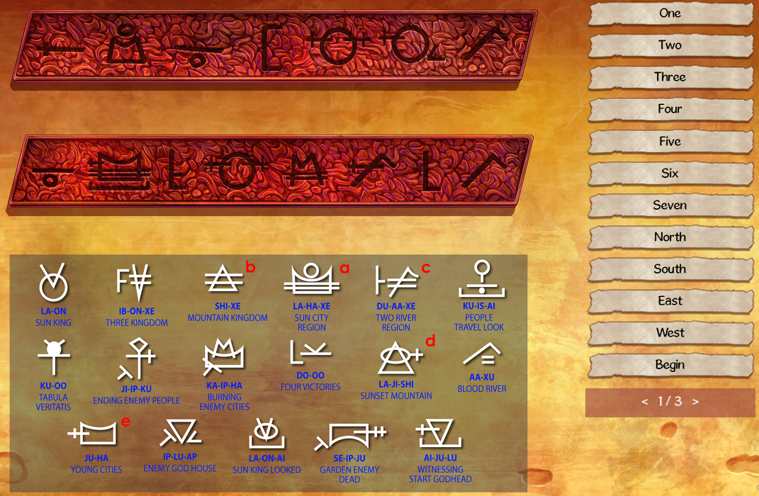Glyph Combination Meaning Line(s) Three Kingdom Three Two River Region Two Four Victories Four 2 Three - Two One Four + One Five 1 Four + Two Six 2 Ending Enemy People ∩ Burning Enemy Cities ∩ Enemy God House Enemy Sun King ∩ Sun City Region Sun Sun King Looked - Sun King Look People Travel Look ∩ Ending Enemy People People People Travel Look - People - Look Travel 1 & 2 Ending Enemy People - Enemy - People End Enemy God House ∩ Witnessing Start Godhead God Witnessing Start Godhead - Look - God Begin 1 Begin + Sun + End Day 1 & 2 Enemy God House - Enemy - God House Begin + Sun + House East 1 Two River Region ∩ Blood River River 1 & 2 Begin + River Source 2 Sun City Region ∩ Young Cities City Sun + City Sun City 1 Burning Enemy Cities - Enemy - City Burning Sun City Region ∩ Two River Region Region Burning + Region Desert 2
