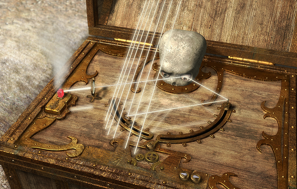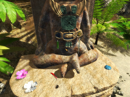 There is an open place for a seashell on the lowest part of the statue where a fish and a yellow seashell are located. There are two places for feathers at the upper left and upper right of the statue's chest. Using the Enigma's reference to sea colors reflected in the sky, place the yellow feather above the yellow seashell. There is no blue feather to correspond to the blue seashell at the foot of the statue, so place the red feather & red seashell on the left side of the statue. The Enigma refers to blended colors, so place the Orange (red + yellow) flower into the hole in the middle of the statue's chest.![]()