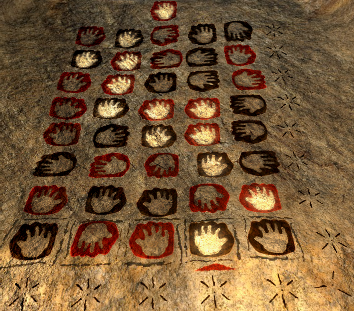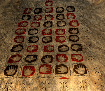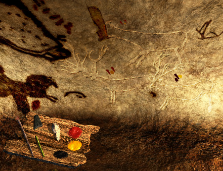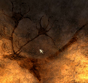 Cross the water to a thin strip of rock in the middle of the lake. Move to the other end and pick up an Aurochs horn and a Long branch. Retrace your steps back across the lake and up to the ledge at the top of the shaft, then use the Aurochs horn to collect some embers from the fire there. Make a one-way trip back to where you found the horn and use it to light the fireplace on the rock in the water. This discloses a row of fourteen stag paintings on the cave wall.