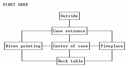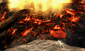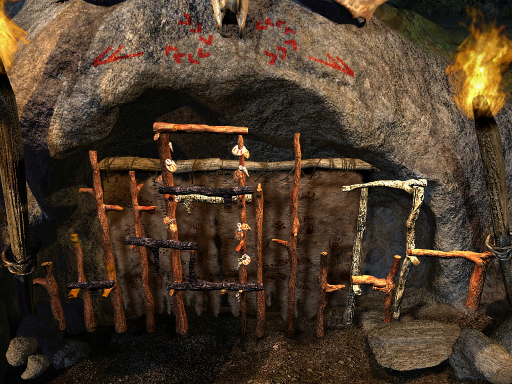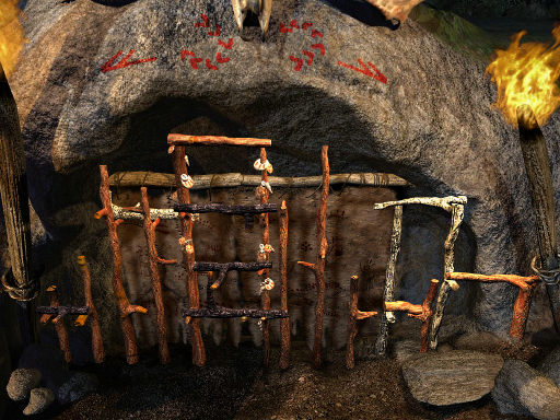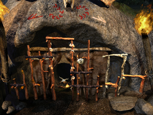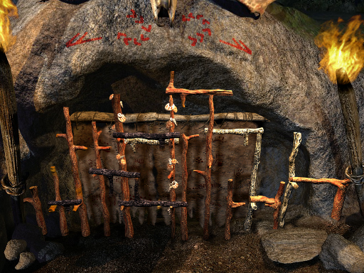 Re-enter the cave, then move right and pick up another load of Branches. Ignite them in the fire as before, then go outside while carrying them. Take the left (uphill) fork in the path and enter a second cave. The game demo ends at this point. Ignite the fireplace at lower right.