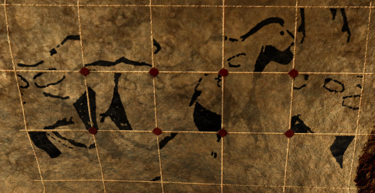 Save your game at this point. A 5 x 3 grid is displayed, consisting of a jumbled arrangement of squares corresponding to the cave painting of an animal. Note that clicking on most squares alternates between portions of an image in black and a somewhat-different one in red. A ghostly background of the black image can be seen on the squares. It can also be seen on the framework of stretched hide facing Klem. Start by setting all squares to the black image by pressing the following ten squares marked with an X: