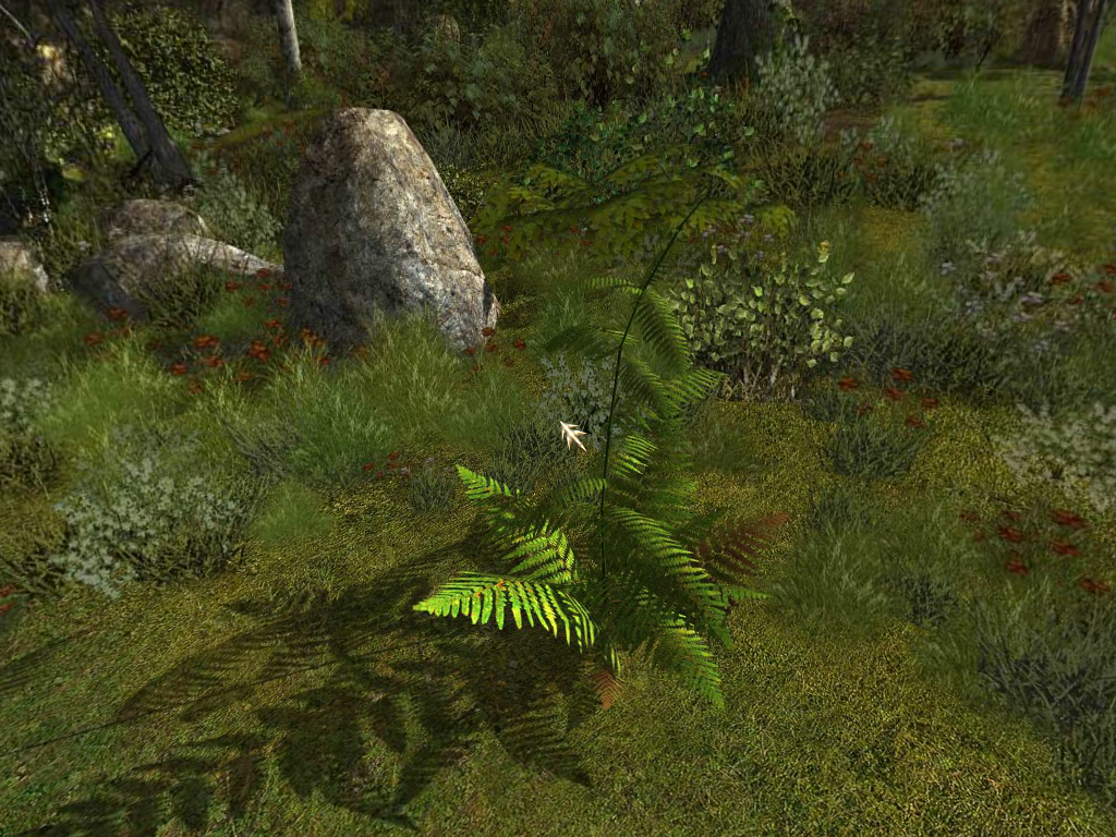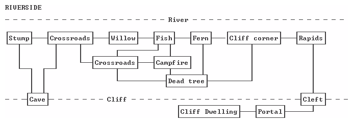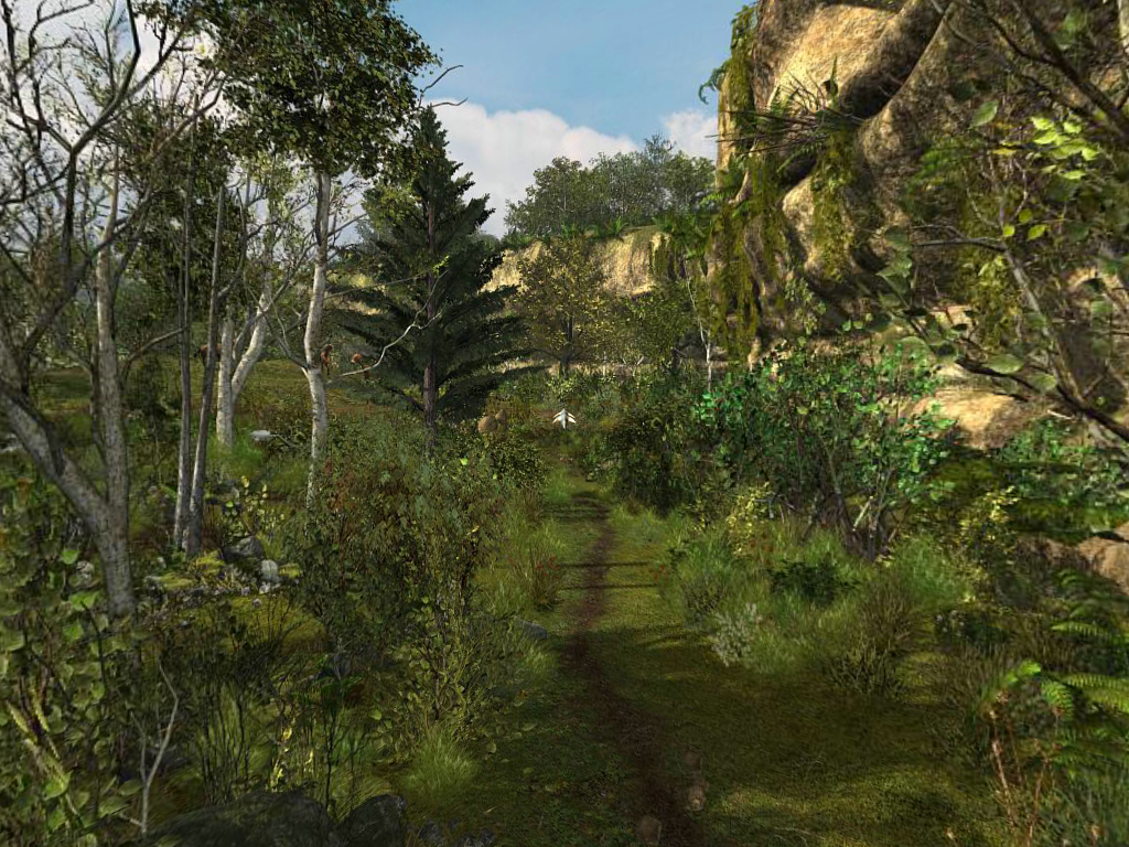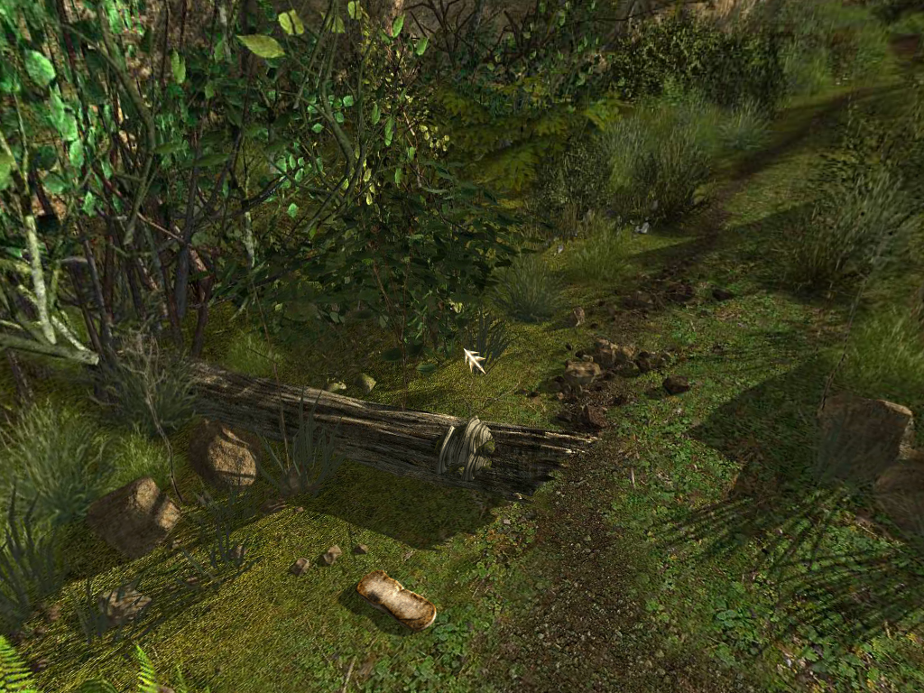 The cliffside forms a corner at this location. Pick up a small Knapped flint from the ground. Turn left and follow the upstream riverside path to a location with a large fern. Pick up a Shaft and the third Worked stone lying in the grass. Continue upstream to a rocky outcropping overlooking a narrow channel in the river, in which salmon can be seen. Pick up the Harpoon point from the rock. There are four path exits from this position; take the one leading uphill to a location with a dead campfire. Pick up a Strap and the fourth Worked stone from the ground near some red symbols painted on a rock.