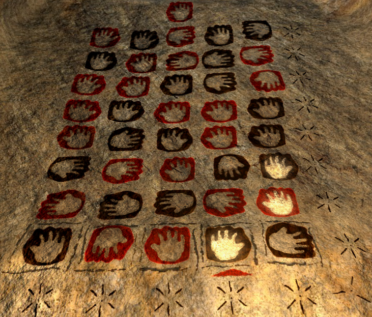 In the final room of the maze, move forward to a pattern of red and black handprints on the wall overhead. Save your game at this point so you have a reference for the default starting arrangement of this puzzle. Click on the grid to access the puzzle, or on the three-pronged symbol at lower right to leave it (instead of the usual red "X" symbol). The objective of this puzzle is to create a path through the grid of handprints to reach the top of the shaft. The handprints in an entire row or column are rotated clockwise when the corresponding row control at right or column control at the bottom is pressed. These controls are indicated by asterisks. A similar puzzle was seen in the electrical switchbox in Safecracker. The starting point of the puzzle is one of the five handprints in the bottom row, selected by clicking on the handprint itself, at which point a narrow red pointer is show underneath to indicate your choice: