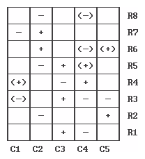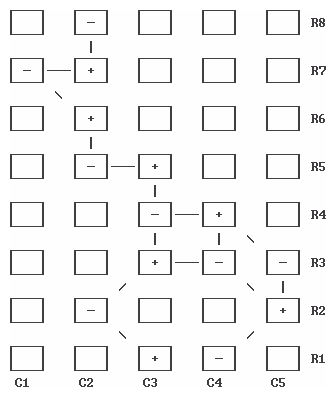 There is no way to include positions (R8,C4), (R6,C4), (R6,C5), (R5,C4), (R4,C1) or (R3,C1) in a continuous chain of alternating signs reaching the top, so these are also removed from consideration. The possible solution paths are shown below:![]()