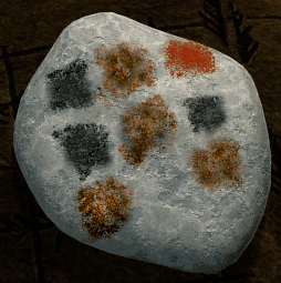 You'll get Klem's painted stone magically added to your inventory. Pick up the Red pigment to the right of the flat stone. Put the Brown pigment, Black pigment and Red pigment onto the painted stone. Turn around and melt the Piece of ice in the dish-shaped receptacle next to the fire. Transfer a drop of water from the dish to the red pigment on the flat rock. Repeat for the other two colors. Fingerpaint the following squares of the grid to match Klem's painted stone: