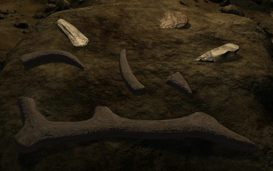 Exit left to the rock table. Put the Deer antlers onto the table with three stone tools in order to manufacture a spearthrower. Pick up the middle tool (Knapped flint) and click it on the antler to remove the three upper branches extending from the lower horizontal portion. Up to four mistakes are tolerated during the process, as indicated by the spearthrower icons at upper right. Next, use the right-hand tool (Awl) to punch a hole in each end of the antler. Finally, use the left-hand tool (Scraper) on the middle of the antler. The resulting creation is shown below: