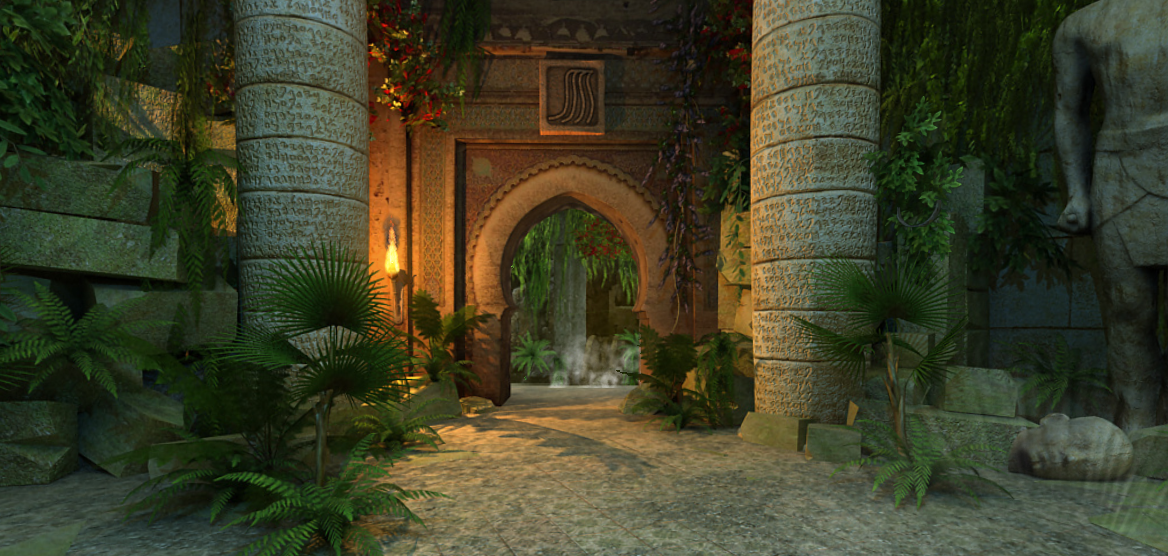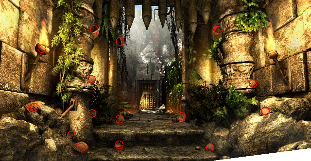 Direction Elevation Location North Horizontal On the ledge at bottom center of the screen Behind some foliage to the lower left of the torch at right At the right edge of the lintel over the opening Down On the steps at left East Horizontal To the right of the stone bowl Farther to the right of the stone bowl, at the bottom of the jumble of blocks To the upper right of the stone bowl On a small shelf above some grass at the lower right corner of the screen Lying flat on top of a stack of two wide horizontal blocks At the bottom of the waterfall, to the right of a centered plant Down At left behind the stone bowl South Horizontal Sticking out from plants halfway up the left portal pillar Up On the top of the lintel On a shelf above a wall carving at lower right Down At the base of the steps West Horizontal Underneath the horse-like statue at left Up At left on top of the lintel At right on top of the lintel At upper right on top of a carved shelf Down Under a fern between the center and right steps