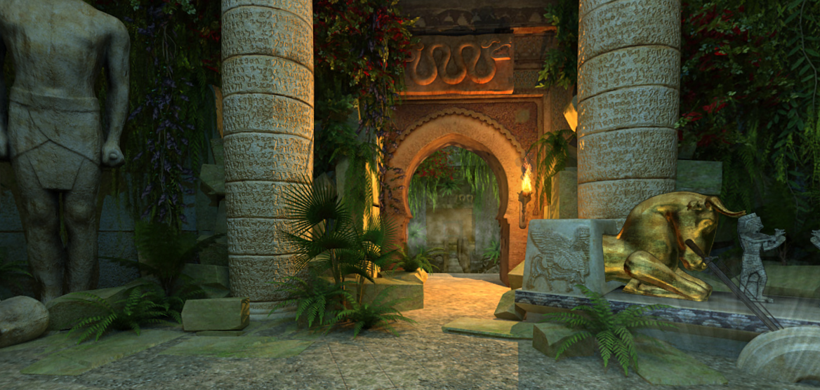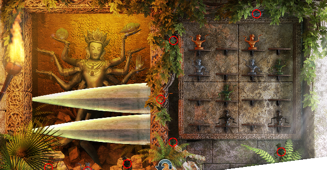 Click on an image for a larger view. Face southwest and enter the alcove flanked by two horse-like statues. Move the mouse over the blades to trigger a comment, then click anywhere on the box of 16 shelves. Solve the HOG for 8 statuettes: